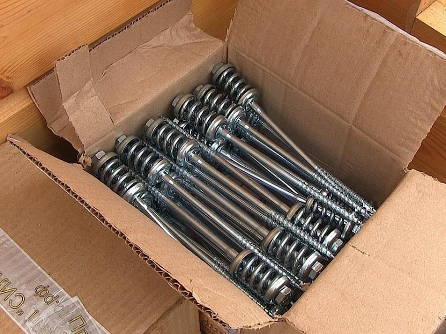 Spring-type fastening “SILA” for the construction of wooden houses to buy at a good price 1.80 eurosSpring bolt “SILA” for the construction of wooden houses: the price of 240 mm - 1.80 euros. Tel: + 375-296-200-567Wooden houses have long deserved popularity with their living comfort. This is an amazing atmosphere, microclimate, good heat retention, aesthetic appearance and the most important ecological cleanliness of the material. The house made of wood, as well as of other materials, is subject to natural shrinkage after installation. After that, the building has a change in the geometry of the walls. In this case, the gaps in the joints of logs may increase, which will worsen the thermal insulation. There is also a factor such as the impact of the environment. This factor can also make its changes in the design, in the form of cracks on the log. Everything depends on the type of wood and climatic conditions of the area where the house is installed. There are many ways to prevent the appearance of cracks on the log and increase gaps after shrinkage and during installation of the structure of wood. One such is the method with the use of the Spring Bolt “SILA” for the construction of wooden houses The design of the spring bolt "SILAr" for the construction of wooden houses is quite simple. In combination with a low price, it deservedly made the system very popular. The pricing of the system depends on its length and the material from which it is made, as well as the quantity purchased on the "take more - pay less" principle. The length should correspond to the diameter of the log. The spring bolt "SILA" for the construction of wooden houses is made of high quality stainless steel or metal with an anti-corrosion coating. The unit itself consists of a long self-tapping screw with a spring and two washers. The screw has a lower part with a thread and a top with a built-in spring with washers at the ends. That's all the simple construction, but very useful in the installation and in the future when shrinking the house. From the description of the spring bolt "SILA" for the construction of wooden houses immediately understand its principle of operation. The spring mechanism is screwed to tighten the logs between each other. The spring, in turn, creates a constant pressure on the joint, so that later, when the wood will be affected by the external environment, avoid cracks, and during the shrinkage of the house, the gaps between the logs do not increase. This very simple method solves very important tasks of preserving the design of the appearance and thermal insulation. And this is not only the comfort of living, but also significant savings during the heating of the house during the winter. The installation of the “SILA” spring bolt for the construction of wooden houses is also quite simple, but some nuances need to be considered. The knot is screwed into a pre-prepared hole. Prepare a hole correctly, to avoid tearing off the thread in the tree with a very large diameter of the hole and avoid a crack with a very narrow diameter of the hole. Therefore, the diameter of the drill for preparing the hole is selected taking into account the lower diameter of the thread of the screw. In the upper log or beam, the hole is made through and stepped. The through hole is prepared by the diameter of the thread, and from above - by a larger diameter under the spring mechanism. The diameter of the opening under the spring mechanism of the “SILA” node should be several millimeters larger than the diameter of the spring itself or the fixing washers of the system. To ensure that the walls of the hole do not jam the work of the spring, the depth of the spring opening must correspond to the size of the spring mechanism in the unclamped state, and that the spring system does not protrude from the log or beam, that is flush with the spring released. It is necessary that the hole is not too deep, does not go deeper than the middle of a log or beam. To do this, you need to correctly choose the length of the node “SILA” In the lower log or beam, the hole for the self-tap is prepared by the deaf, its diameter must correspond to the upper log for the thread of the screw. The depth can be up to the center of the diameter of the log or slightly deeper. At this stage the hole preparation is finished. Then we twist the knot “SILA”, tightly drawing together a beam or log. It is necessary to tighten not only until the spring of the system is completely compressed, but also until the logs or bars are pressed together tightly together. The special gasket between the logs must be tightly pressed, and of course, no large gaps. Subsequent logs or beams are stacked and clamped in the same way, only with the center of the hole for the spring unit “SILA”, staggered, thereby distributing the load on the tree. The advantage of the “SILA” spring bolt for the construction of wooden houses is a simple design, low price and reliability. Spring bolt “SILA” for the construction of wooden houses to buy at a good price 1.80 euros Experts know that after installing a wooden house, they let him settle. During this time, the remaining moisture from the wood should leave, and the house sits down during this time. Typically, in time it takes about a year for a building of logs and a little less time - for a house of timber. Only after that they are engaged in finishing works with further settling. But if the spring bolt "SILA" is used for the construction of wooden houses, the time for shrinkage is significantly reduced. For the construction of logs quite a few months, and for the house of glued beams even less. Of course, you need to take into account the time of year and the climatic region of construction. But in general, it significantly shortens the time until the long-expected housewarming. The spring bolt “SILA” for the construction of wooden houses retains good thermal insulation and the appearanc