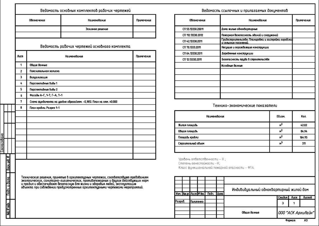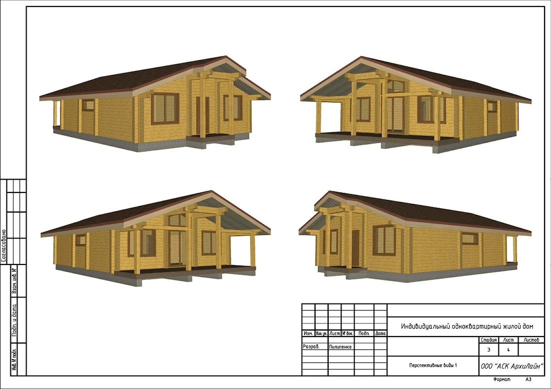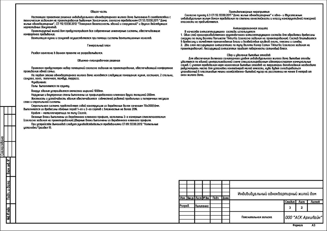 Each project has an individual approach, so only the sheets you need can be developed. Now let's talk in more detail about why this or that sheet is intended and what kind of information it carries. The first sheet is necessary for informing about what was developed for you in this project. Also a list of normative documents that was taken into account when implementing the project is presented, if necessary, you can familiarize with them. Technical and economic indicators give an idea of the area and building volume of the house. The second sheet - PZ (explanatory note) informs on the volume-planning decision of your dream house, on its supporting structures, external and internal decoration, all wooden internal elements. All this is preliminary agreed with you, taking into account your wishes and your idea. Thanks to the third sheet you can see what the future dream house will look like from all sides. On the facades are placed all the marks of levels, to understand the scale of the structure. Also all openings are measured. Layout of the foundation at the level of the cutoff (the level at which the house itself will be erected) with all dimensions, to be able to measure the erected foundation and compare it with the drawings. The plan of the floor plan with the proposed furniture arrangement by the architect is necessary so that you can understand and present the layout of the future structure and the area of all the premises. Each design stage is coordinated with you and changes according to your wishes, in the event that it is constructively impossible to accomplish anything, the designer of the company will explain to you why this is not recommended and will offer an alternative option that will suit both sides. The next sheet is the roof plan, which marks the slope angle and dimensions of the skates, as well as the marks of the ridge and the bottom of the overhangs. Section with the indication of the level of the clean floor, the size of the openings, and the marks of overhangs and skate.