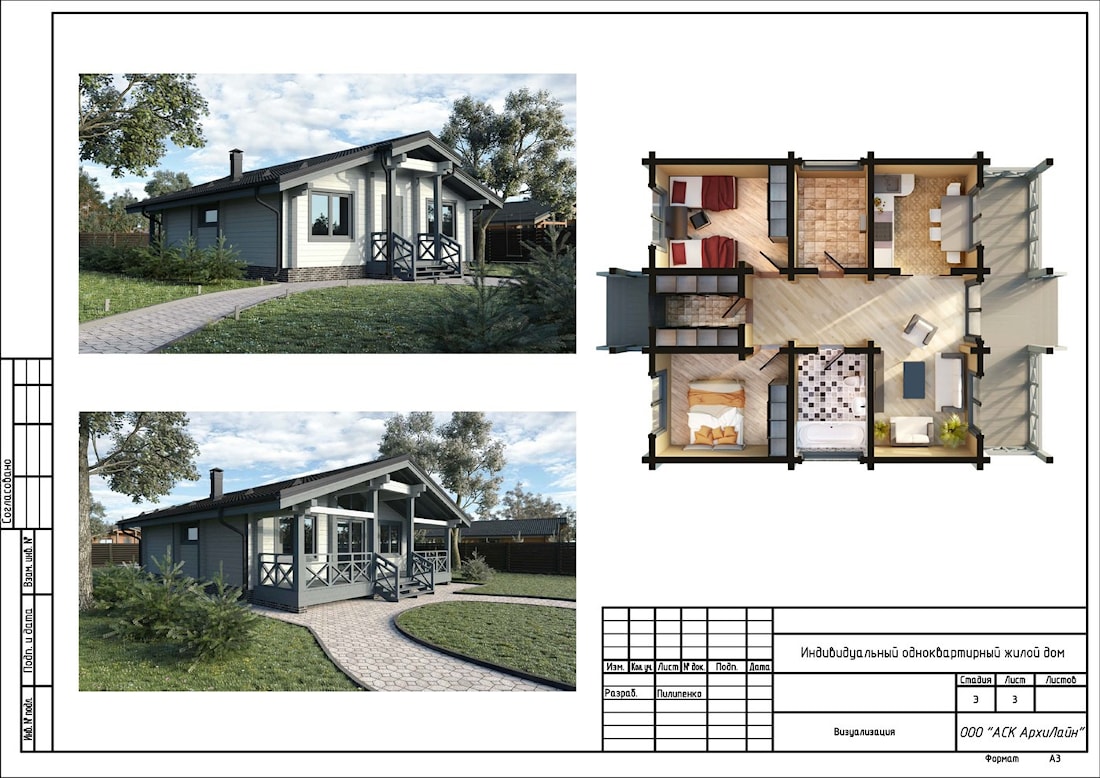 A typical project of a house made of timber "Eurodom-1" - 80-90 square meters You still do not know what is the first step you need to take to realize your dream of a wooden house? ArchiLine Log Houses can give you an unambiguous answer - start with the project! Ideas come to mind one after another, thoughts are thrown from one appearance to another, from planning to planning, and it's very difficult to put everything together and imagine what the outcome will suit you. Do not long to suffer, the output is simple - contact the specialists! Experienced managers of the company ArchiLine will listen to all your wishes, and architects will take them into account when doing the project just for you. The main idea of the project is to develop a house that meets all modern requirements, such as comfort, convenience of planning, individuality of the idea. Make it perfect in terms of communications, but at the same time inexpensive in price. The task is not easy, but our architects coped with this without difficulty. In the project of this individual one-storey house of a beam, 2 spacious bedrooms, a kitchen, a living room, in which the whole family, a bathroom, a furnace, a lobby, a hall and a terrace can be placed, where you can put a table and chairs and sit comfortably over a cup of tea, reading an interesting book, as well as gather a large company and relax in nature. In order that you understand that these are not empty words, below in this article we present to your attention the developed project of a wooden house made of laminated veneer lumber, all the necessary documentation for its coordination and further construction. In this project we developed: